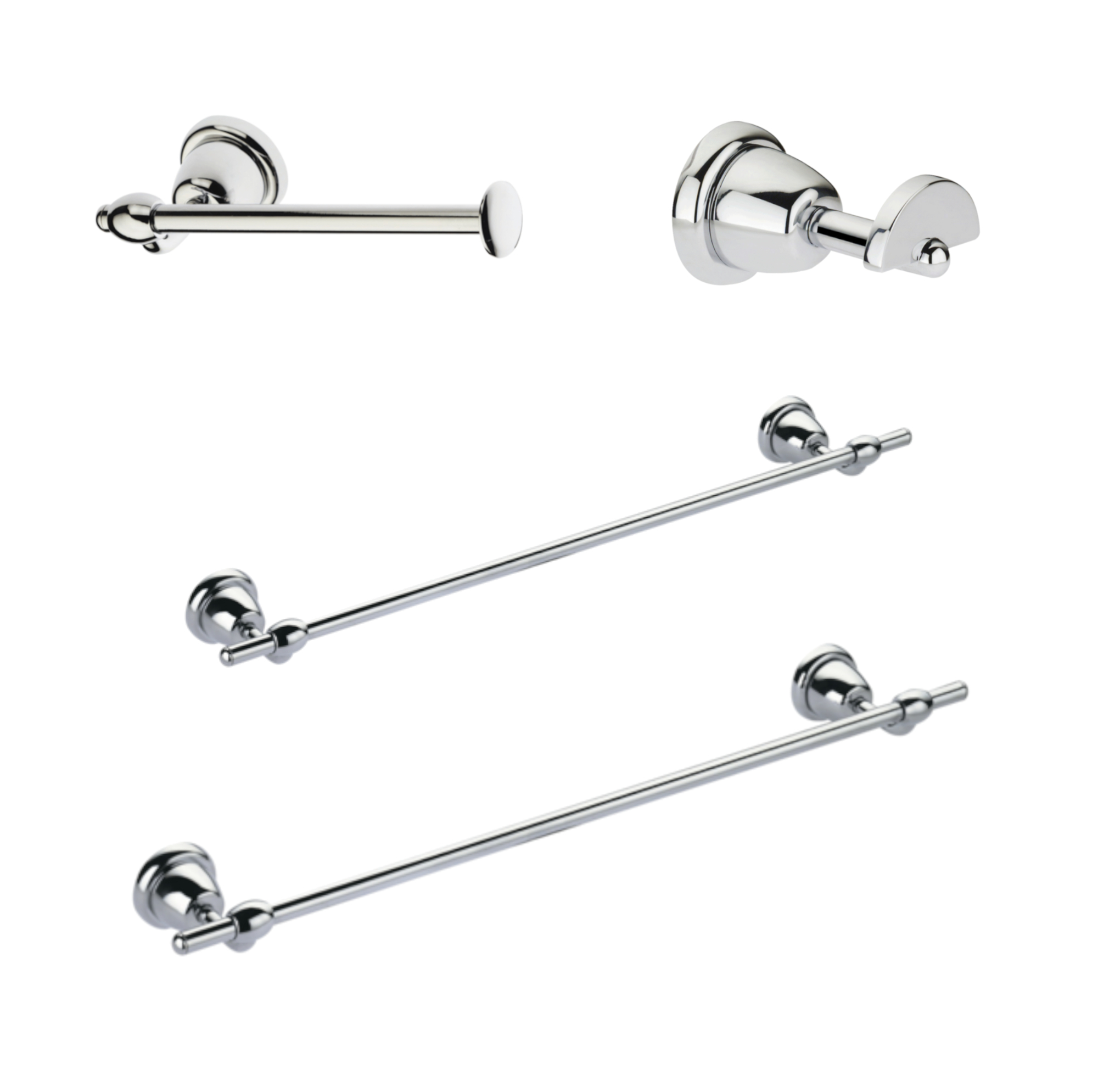 Set di accessori da bagno da parete per un bagno minimal e funzionale, senza ingombri sul piano d'appoggio del lavabo. La linea si compone di due porta salviette di diverse dimensioni, un porta rotolo per la carta igienica e un appendino da muro singolo per le salviette o per l'accappatoio.