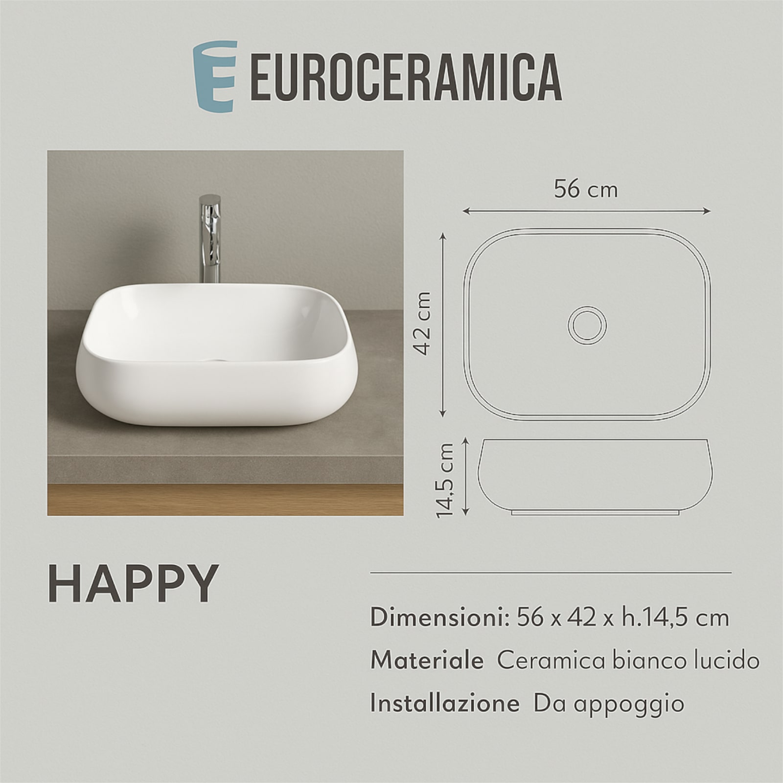 Il lavabo da appoggio Euroceramica è un elemento di design elegante, ideale per arricchire il tuo bagno con stile e funzionalità. Con le sue dimensioni di 56x42 cm, questo lavabo offre una generosa area di utilizzo pur mantenendo un aspetto compatto. Realizzato in ceramica bianco lucido, garantisce una finitura luminosa e resistente nel tempo, facile da pulire e da mantenere in perfette condizioni. Questo lavabo non solo rappresenta una scelta estetica moderna, ma grazie ai suoi materiali di alta qualità, assicura anche durabilità e un valore aggiunto all'intero ambiente bagno.