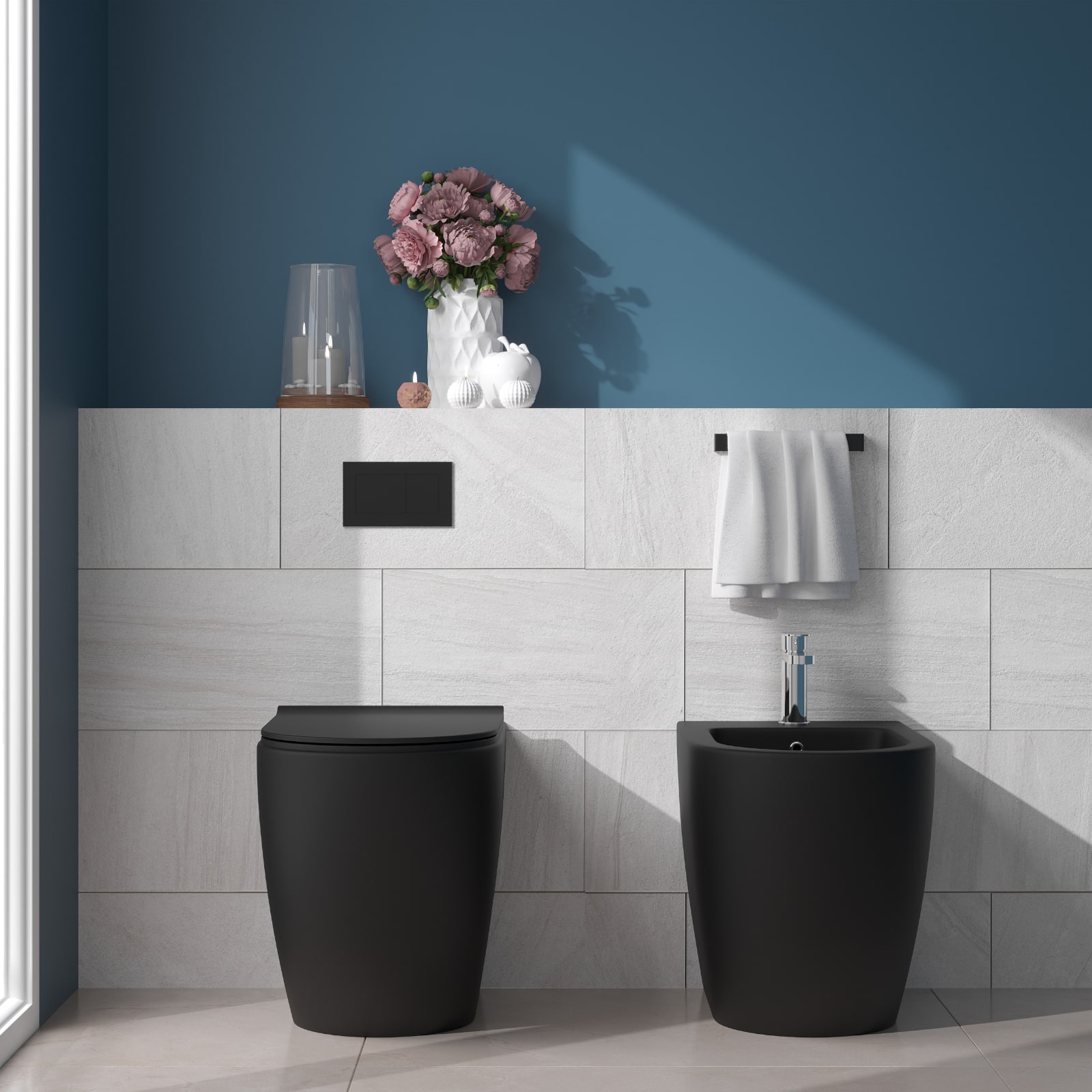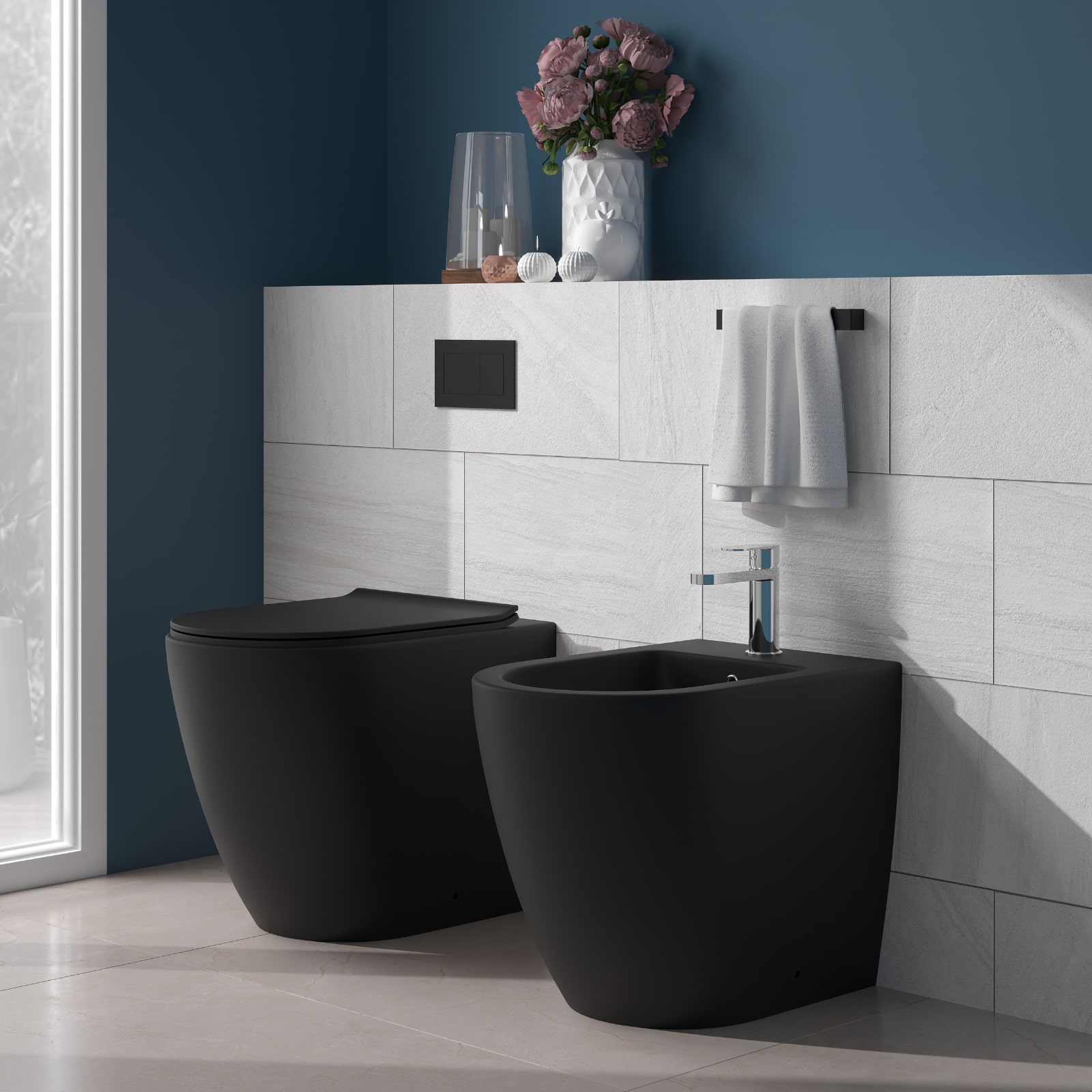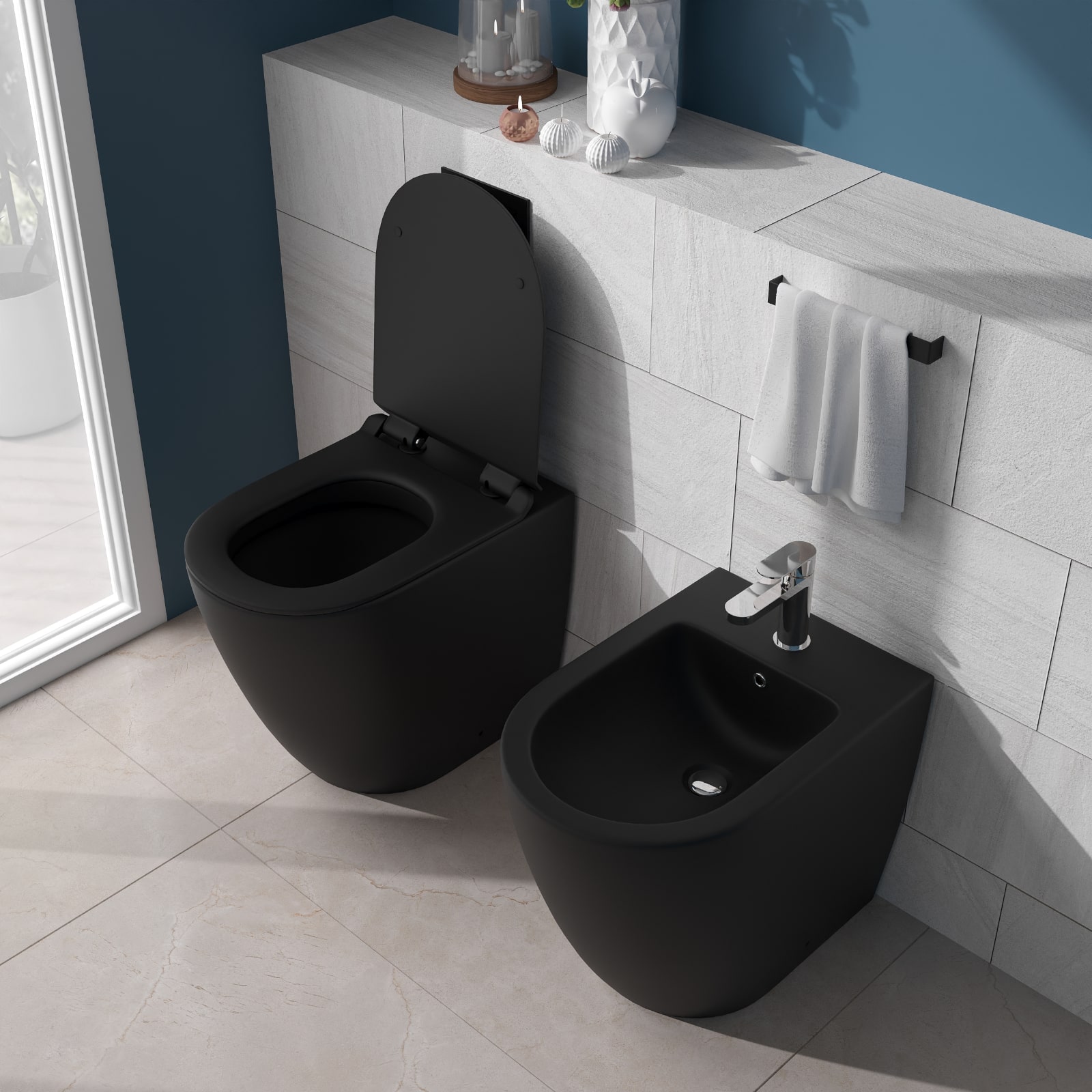Sanitari filomuro nero opaco rimless con copriwc soft close