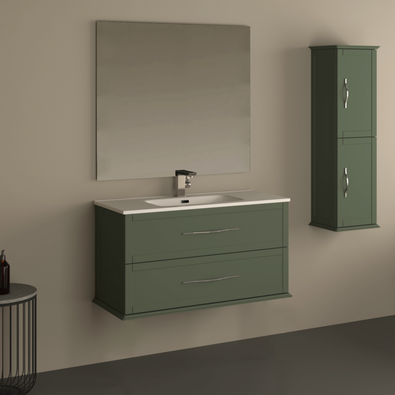 La composizione bagno verde opaco, si presenta con una base sospesa in massello, dotata di ampi cassetti con modanature classiche e chiusura ammortizzata.