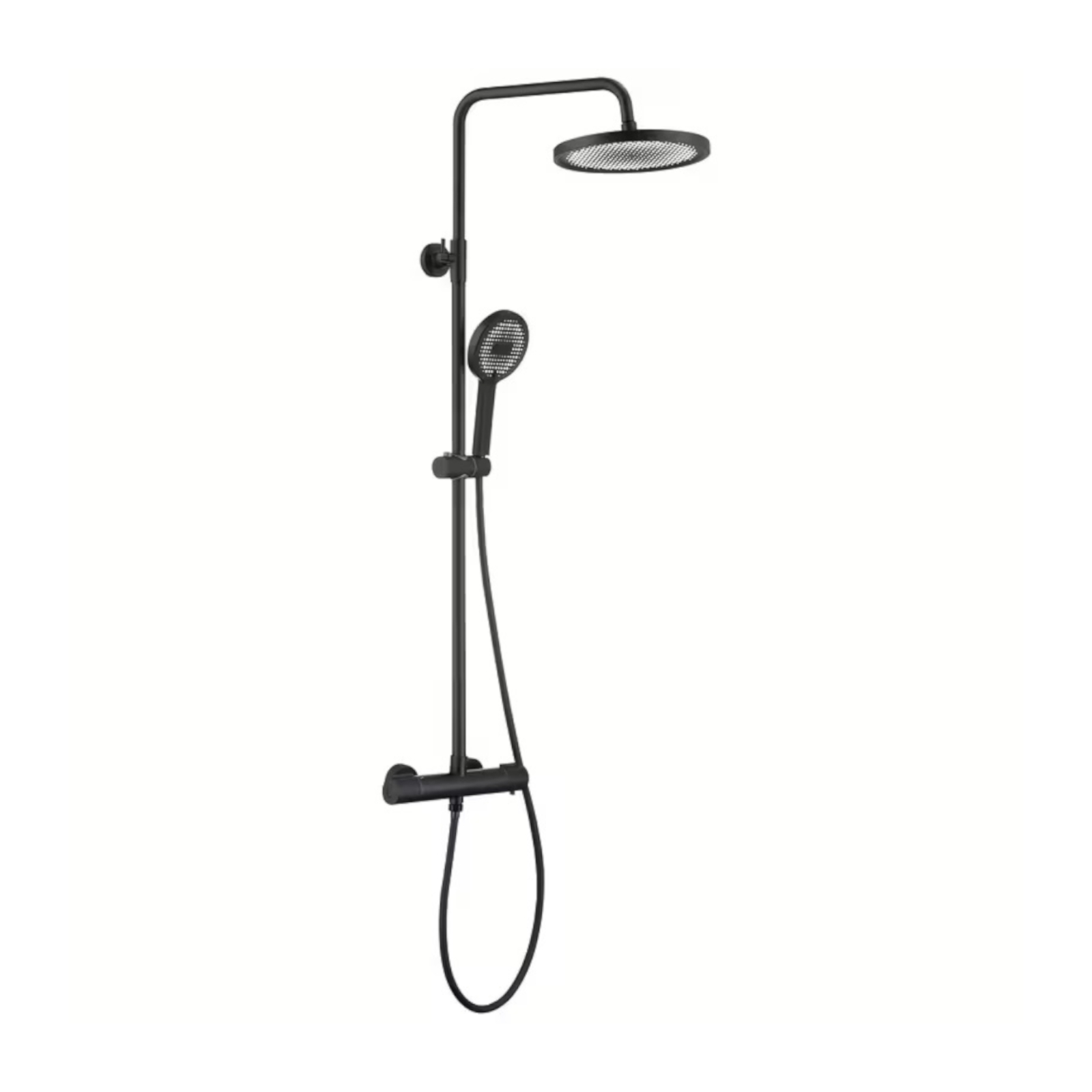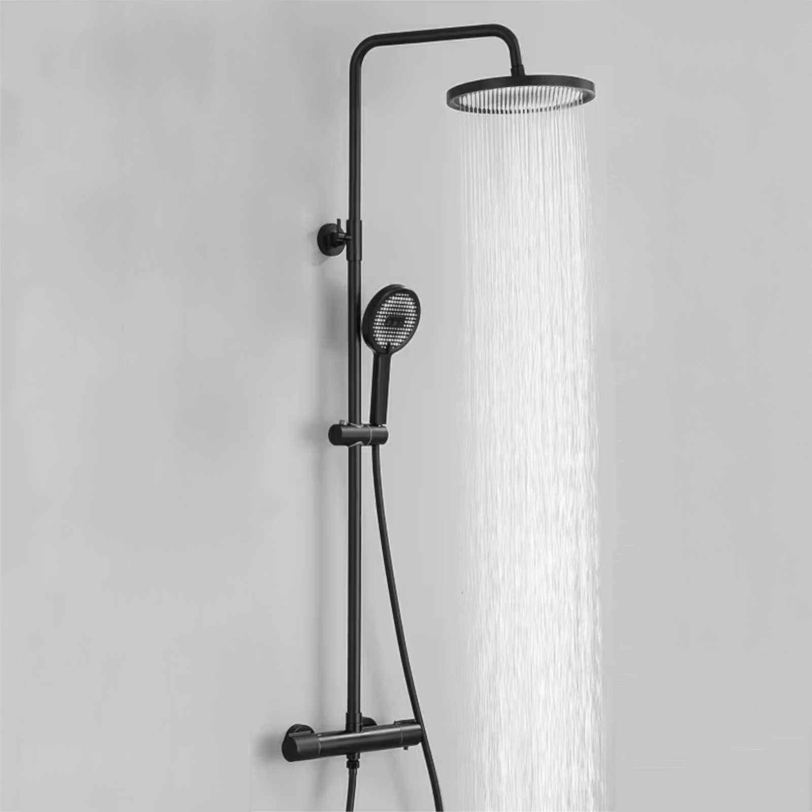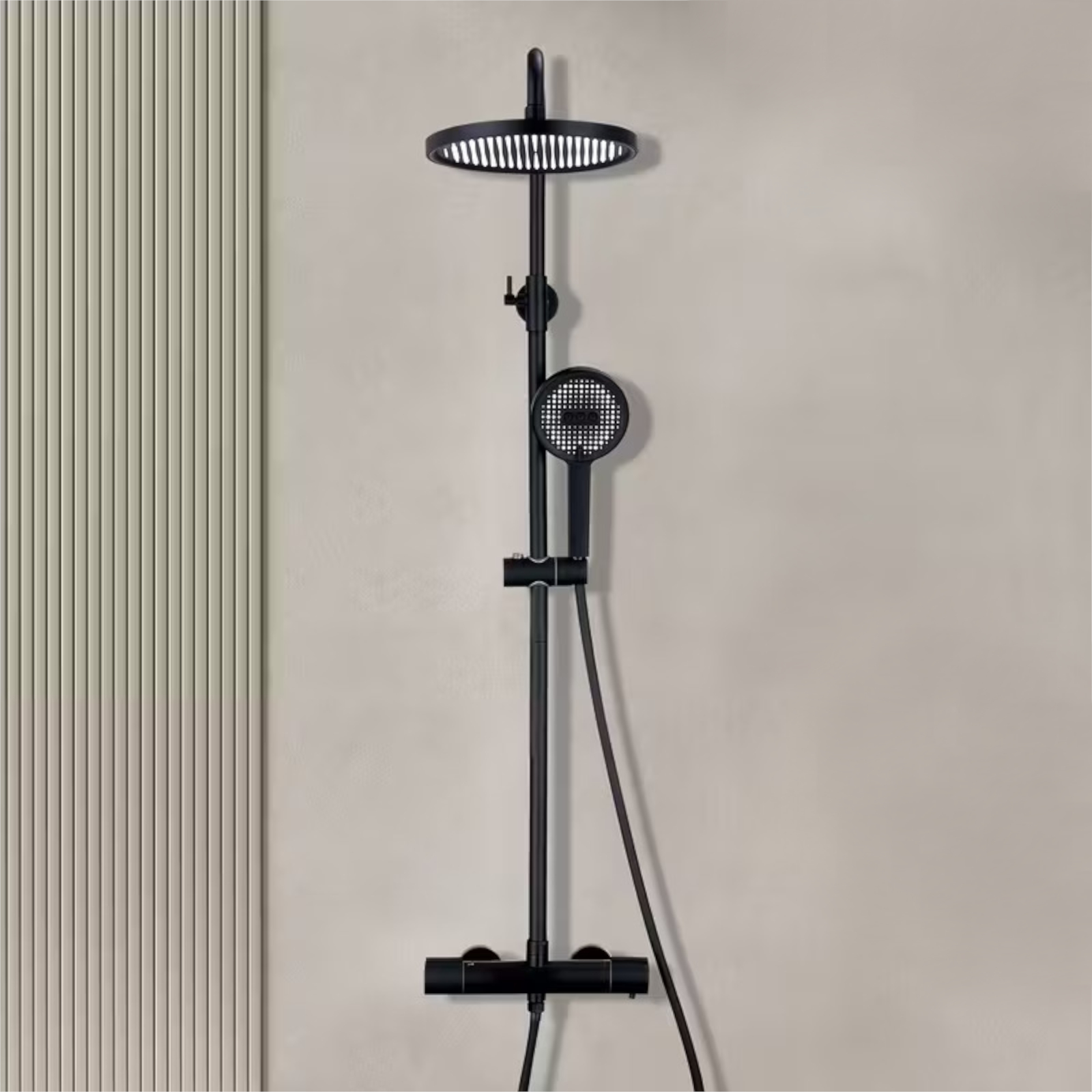 La colonna doccia termostatica nero opaco è pensata per chi cerca un mix perfetto tra design moderno e praticità. Il soffione tondo ampio regala un getto avvolgente, la doccetta a tre funzioni permette di scegliere l’intensità ideale e il miscelatore termostatico assicura sempre la giusta temperatura senza sbalzi improvvisi. Un tocco di stile che eleva il tuo bagno.