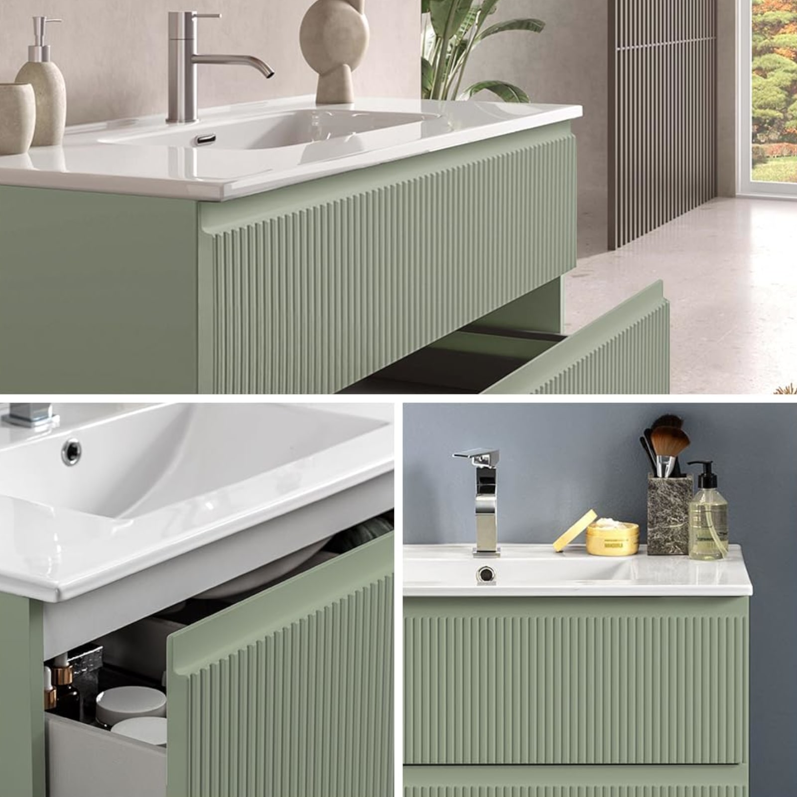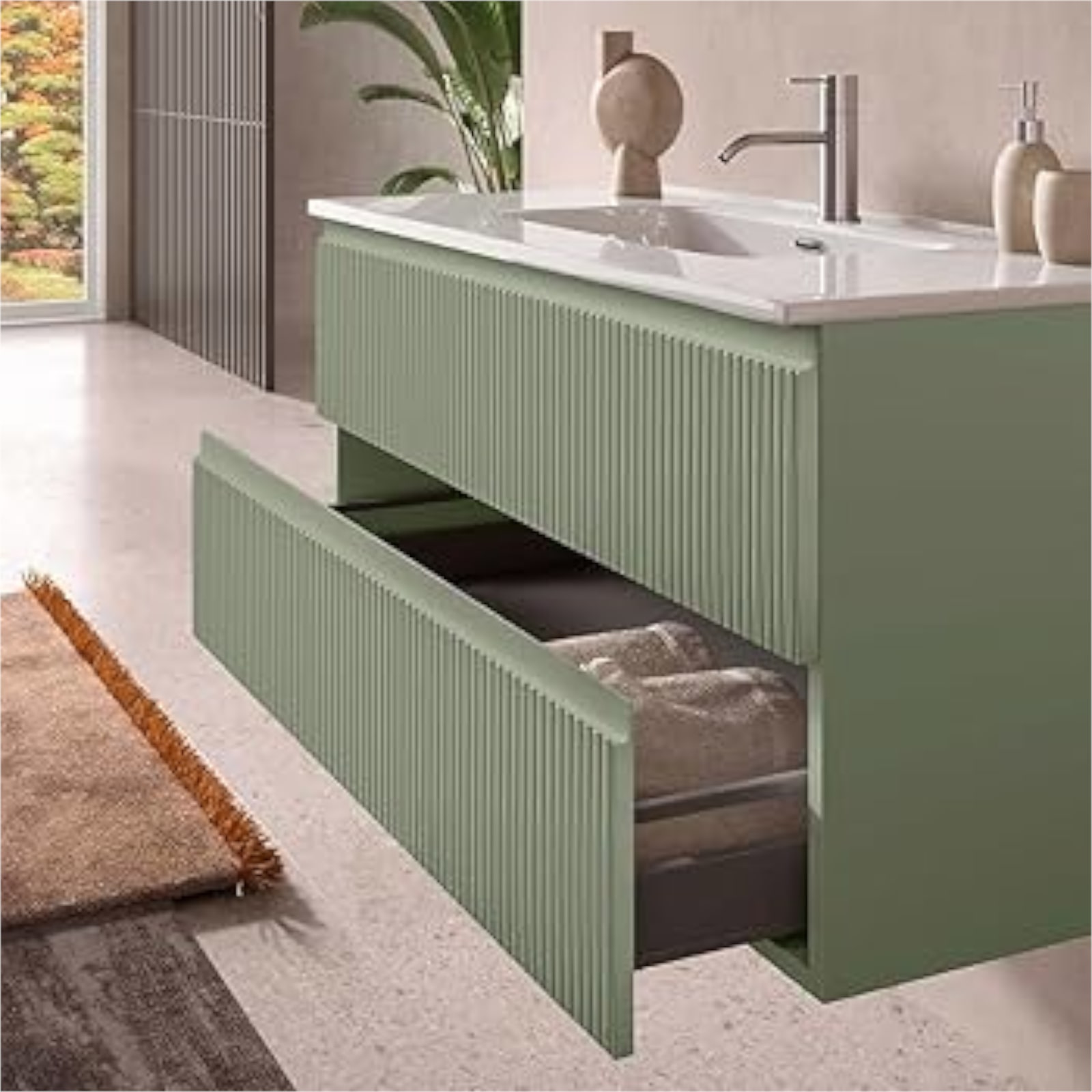 Mobile bagno sospeso cannettato, doppio cassetto, 100 cm salvia opaco