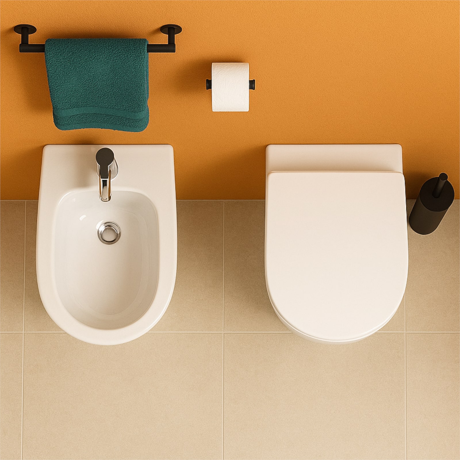 Coppia sanitari filo muro rimless Azzurra Ceramica serie Comoda con sedile slim soft close
