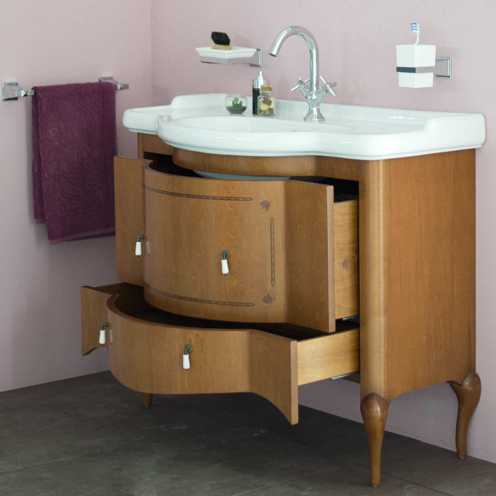 Link correlati a "Mobile bagno classico 100 cm legno massello noce dorato doppio cassetto con lavabo in ceramica"