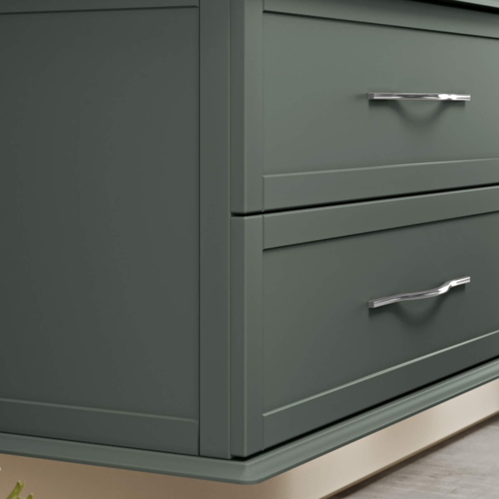 La composizione bagno verde opaco, si presenta con una base sospesa o corredata da eleganti piedi in massello, dotata di ampi cassetti con modanature classiche e chiusura ammortizzata.