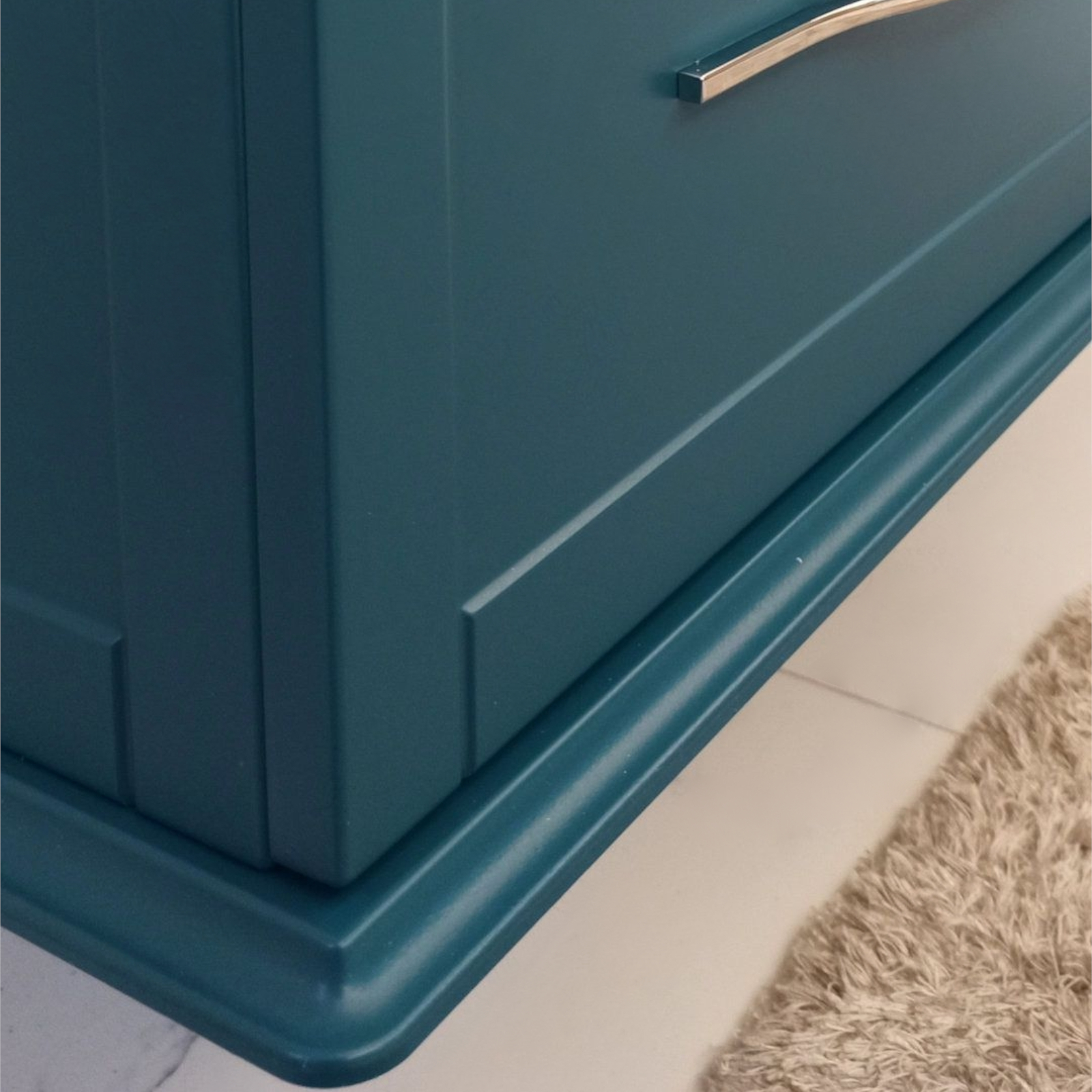 Il design del mobile Cleo si ispira alla tradizione artigianale italiana, caratterizzato da linee morbide e dettagli ricercati. La sua finitura in Blu Petrolio si ottiene attraverso un processo di verniciatura attentamente eseguito per garantire una lucentezza e una profondità di colore eccezionali. La struttura è costruita con legno massello, che offre una notevole stabilità e un aspetto lussuoso. Le maniglie e le cerniere sono realizzate in metallo cromato, che non solo aggiunge un tocco di modernità, ma assicura anche una lunga resistenza a usura e umidità, caratteristiche ideali per l'ambiente bagno.