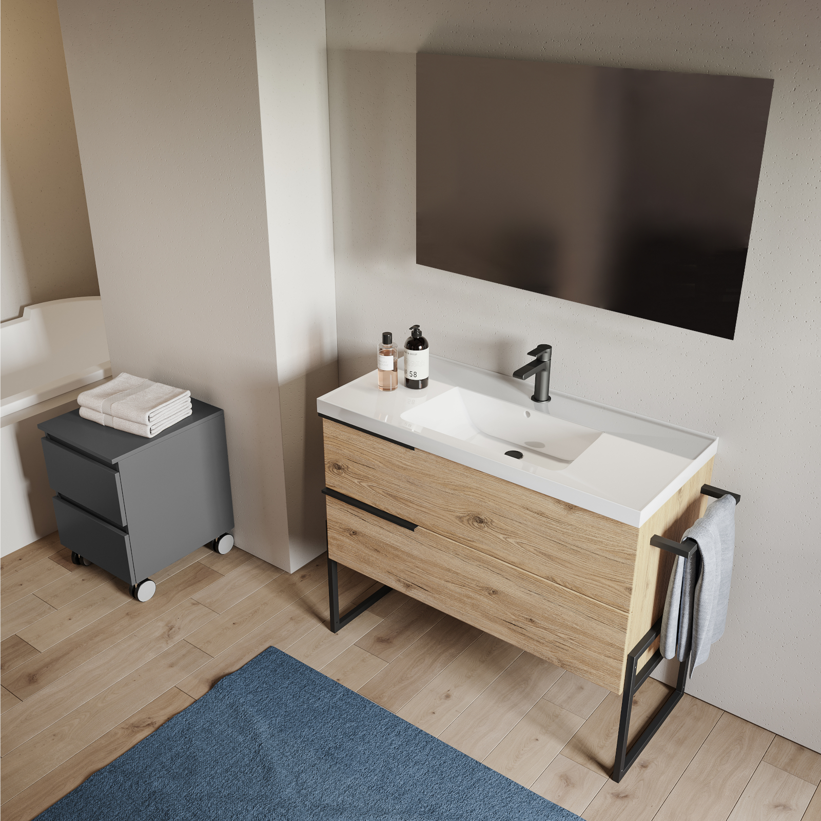 Realizzato in Mdf, questo mobile da bagno esprime tutta la qualità dei materiali utilizzati. Noto per la sua longevità e resistenza, caratteristiche che ne fanno la scelta ideale per un ambiente come il bagno, soggetto a umidità e utilizzo frequente. La finitura naturale mette in risalto le venature uniche del legno, creando un effetto visivo di grande impatto. Il design prende spunto dalle tendenze contemporanee, combinando linee pulite e forme geometriche per garantire un’estetica di classe e modernità. Ogni dettaglio è stato curato nei minimi particolari, dai manici minimalisti ai cassetti scorrevoli, per assicurare una fruibilità e durata eccezionali.