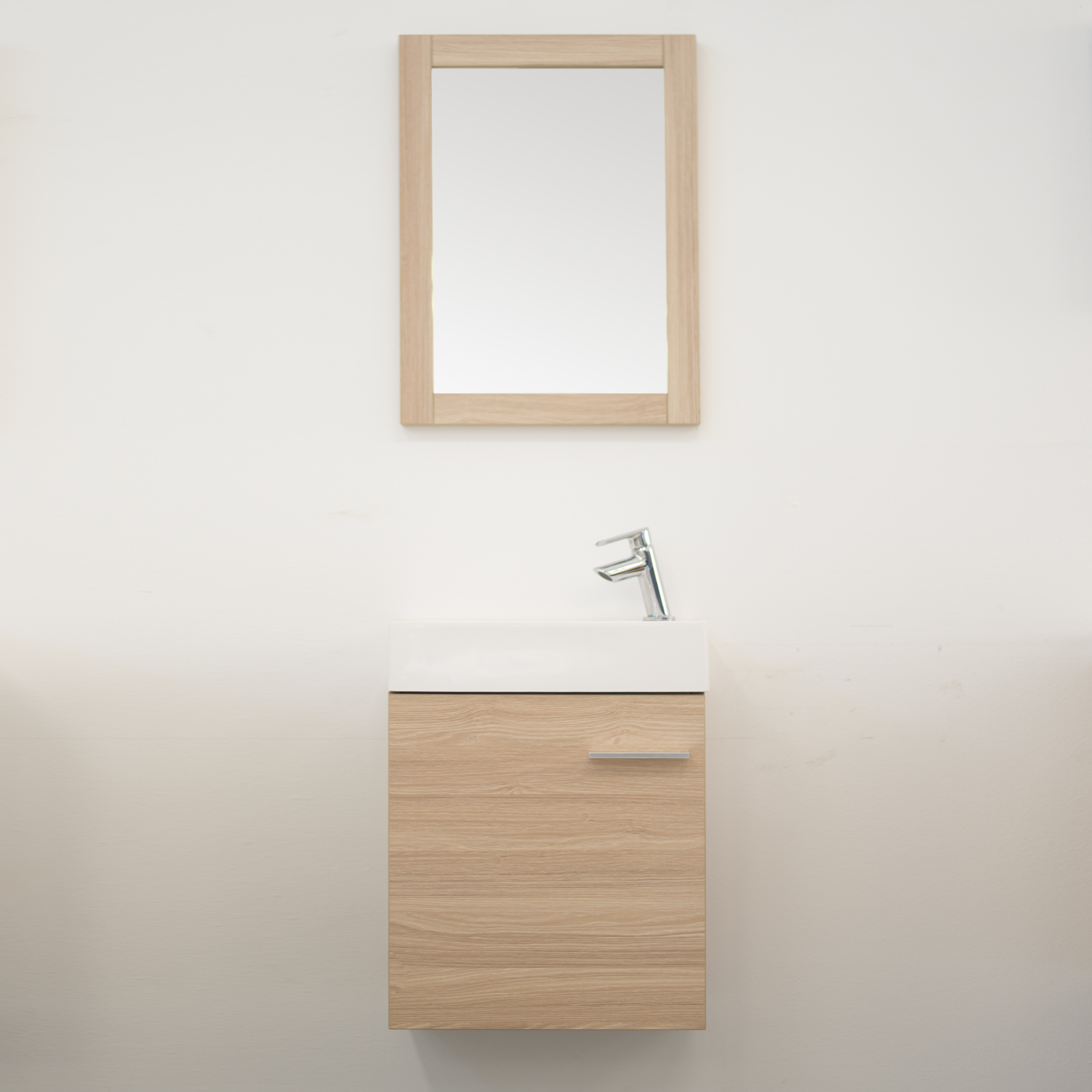 Link correlati a "Mobile sospeso bagno 45 cm rovere chiaro con anta e specchio con cornice"