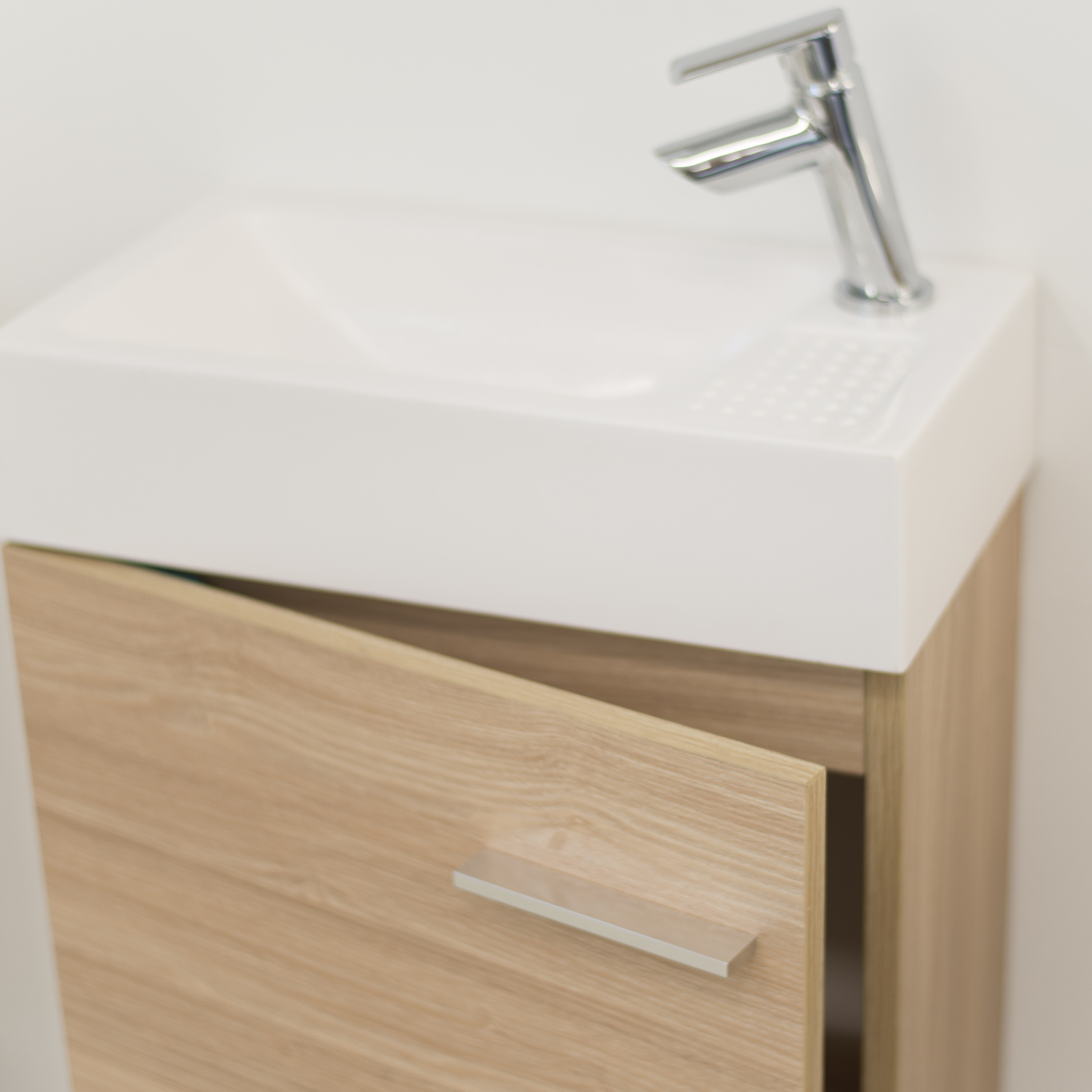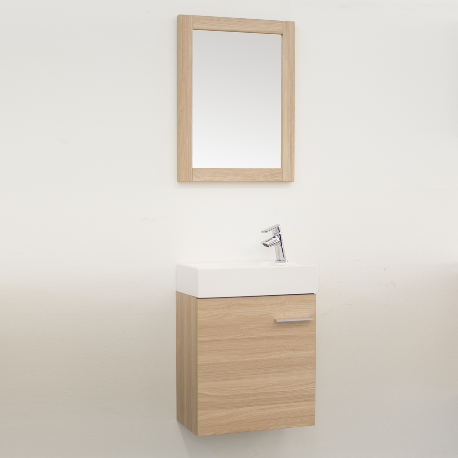 Mobile bagno sospeso con un'anta da 45 cm rovere chiaro, incluso di lavabo e specchio.