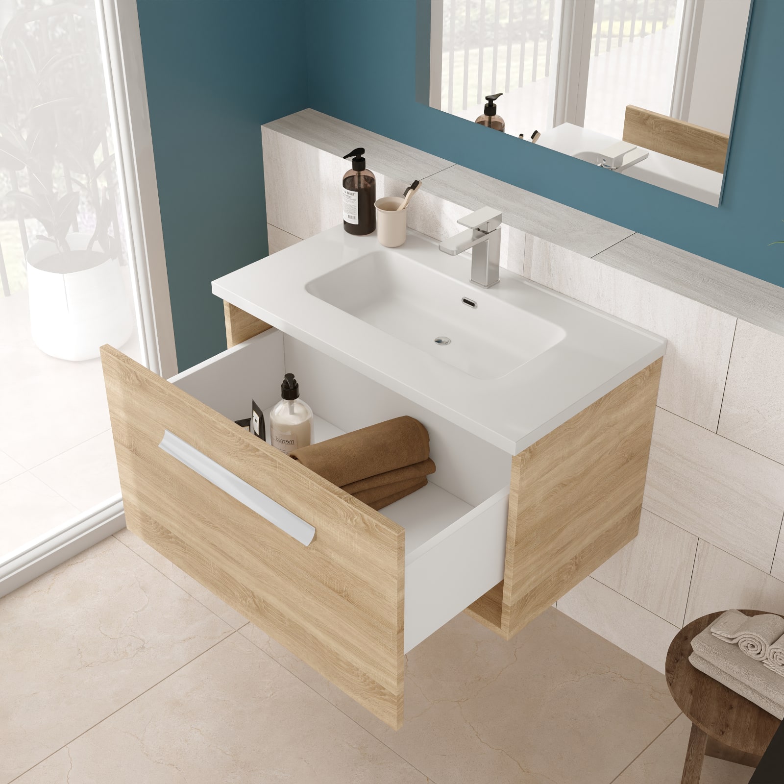Mobile bagno sospeso 100 cm rovere chiaro cassetto singolo con specchio e lampada | aura