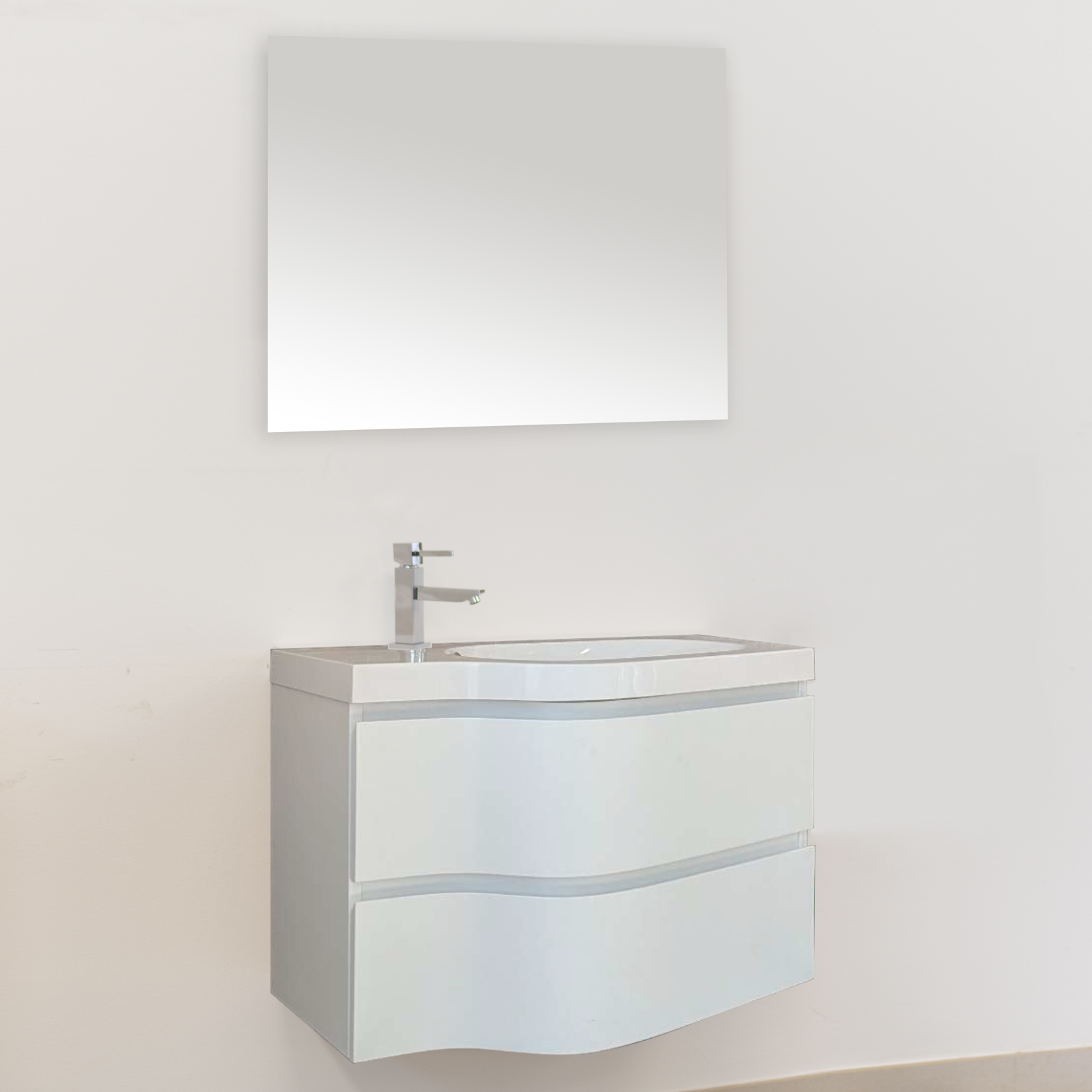 Mobile sospeso da 80 cm con doppio cassettone, color bianco opaco, con lavabo in mineral marmo e specchio filolucido. Il design ondulato e le rifiniture moderne conferiscono movimento all'interno dello spazio bagno, rendendo il prodotto estremamente adatto ad ogni stile e ad ogni arredo, perfetto anche per gli ambienti tradizionali. Il doppio cassettone dona funzionalità in quanto consente di contenere al suo interno oggetti di utilizzo quotidiano mentre il lavabo in mineral marmo con base d'appoggio a destra permette di tenere a portata di mano tutto ciò che si desidera. RIEPILOGO CARATTERISTICHE: " Categoria: mobile bagno 80 cm con doppio cassettone " Tipologia: sospesa " Dimensione mobile: 80x46x48 cm " Materiale: MDF effetto legno " Colore: bianco opaco " Sistema di chiusura cassetti: soft close " Materiale lavabo: mineral marmo " Dim. specchio: 80x60 cm " Prodotto ecosostenibile " Imperbeabile all'acqua e all'umidità " Verniciatura: 5 strati " Specchio in foto acquistabile separatamente " Specchio filolucido reversibile INCLUSO.