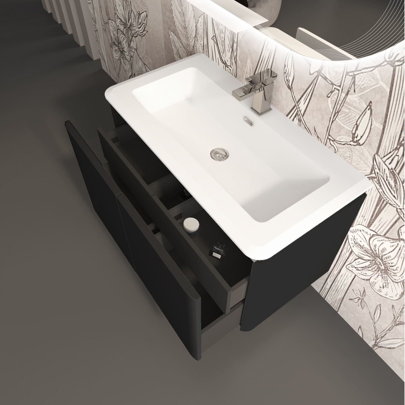 Un mobile altamente contenitivo nella misura di 95 cm con i fianchi stondati che riprendono la bellezza del top in resina altamente contenitivo, cassetti multifunzione dotati di guide slim con un confortevole sistema di chiusura rallentata.