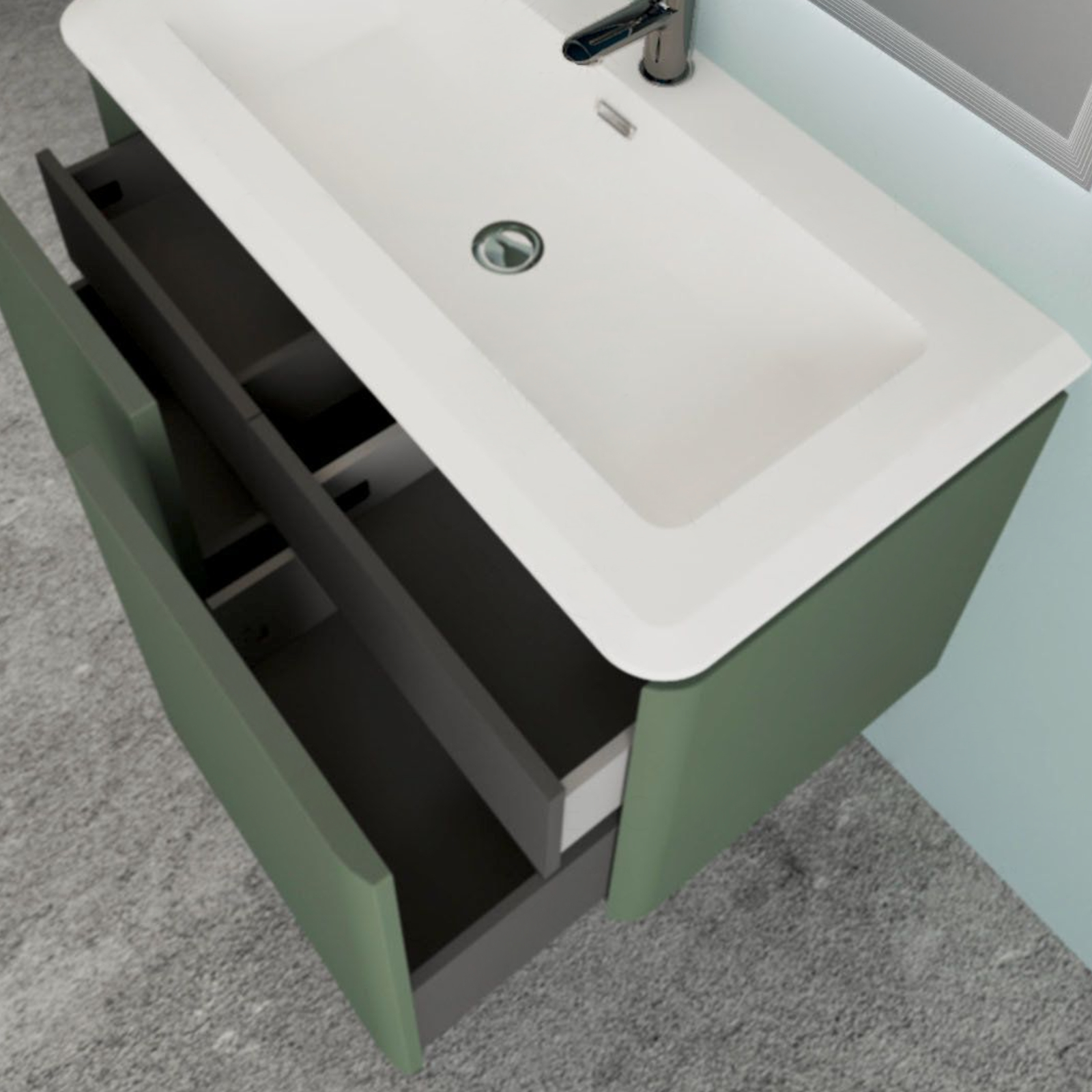 Link correlati a "Mobile bagno sospeso cindy 95 cm verde opaco con quattro cassetti e specchio led"