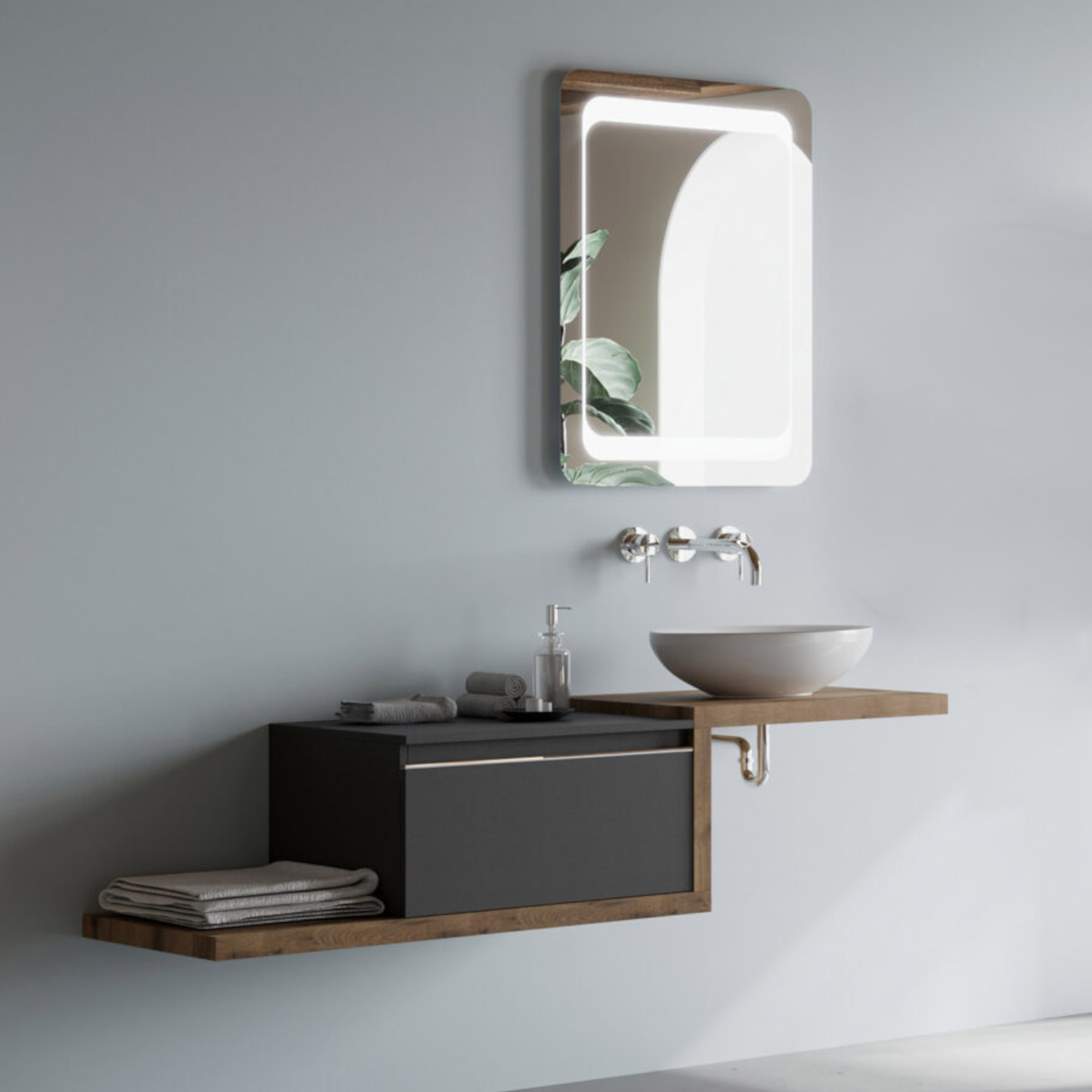 Composizione bagno sospesa da 180 cm rovere naturale con cassettone e specchio filo lucido