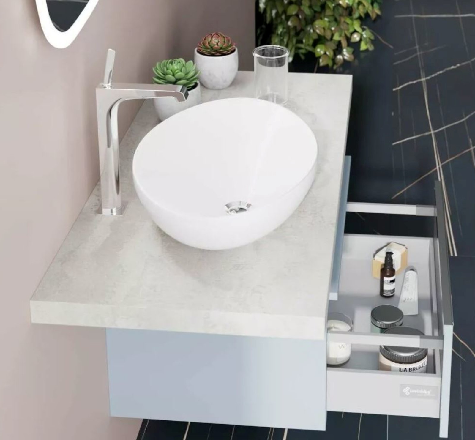 A completamento il cassettone con chiusura soft close il cui colore blu pastello conferisce stile ed eleganza all'ambiente bagno mentre la capienza interna, consentendo di tenere in ordine la stanza, lo rende un elemento necessario e funzionale.