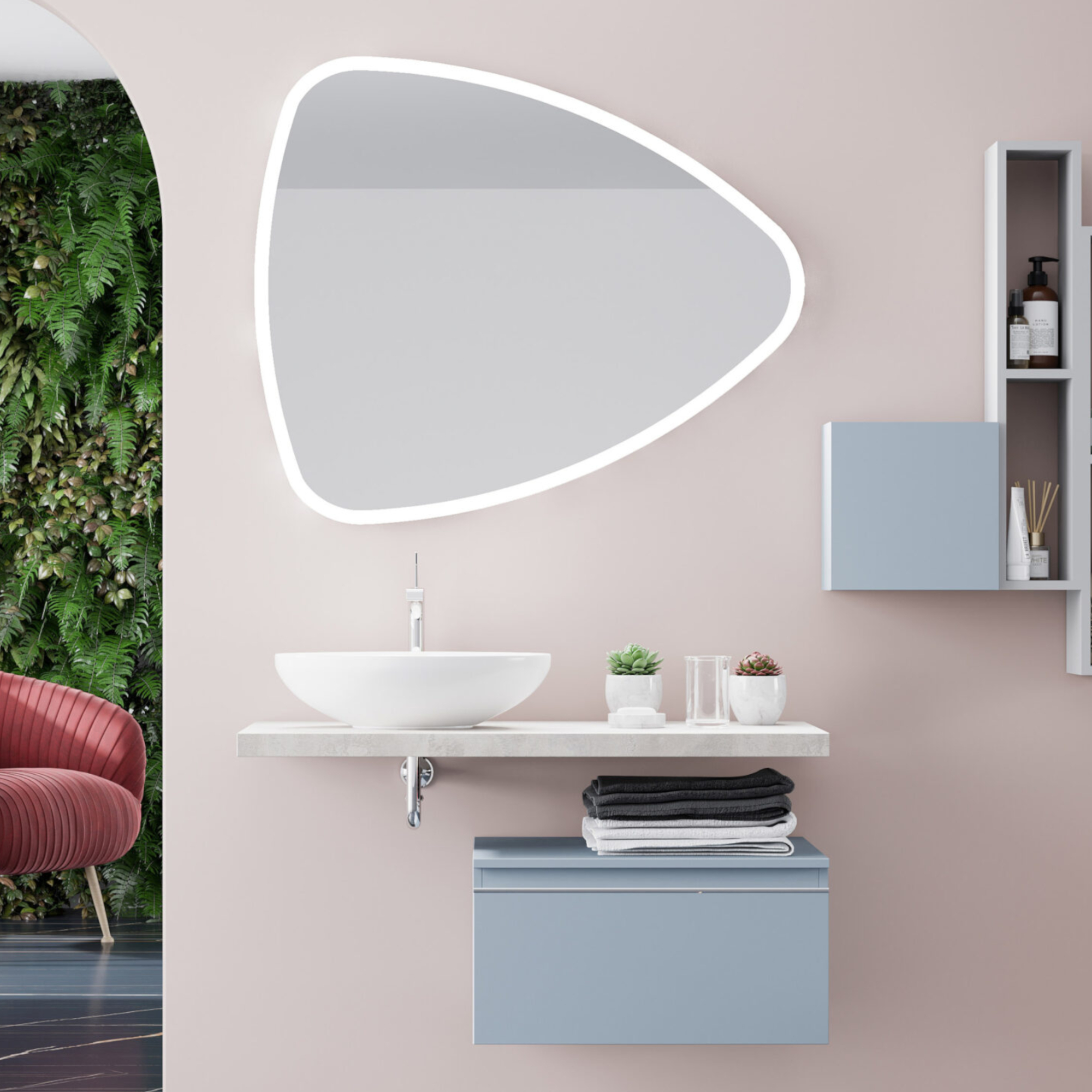 Composizione da bagno con mensolone da 100 cm color beton effetto cemento, cassettone blu pastello da 80 cm e specchio filo lucido.