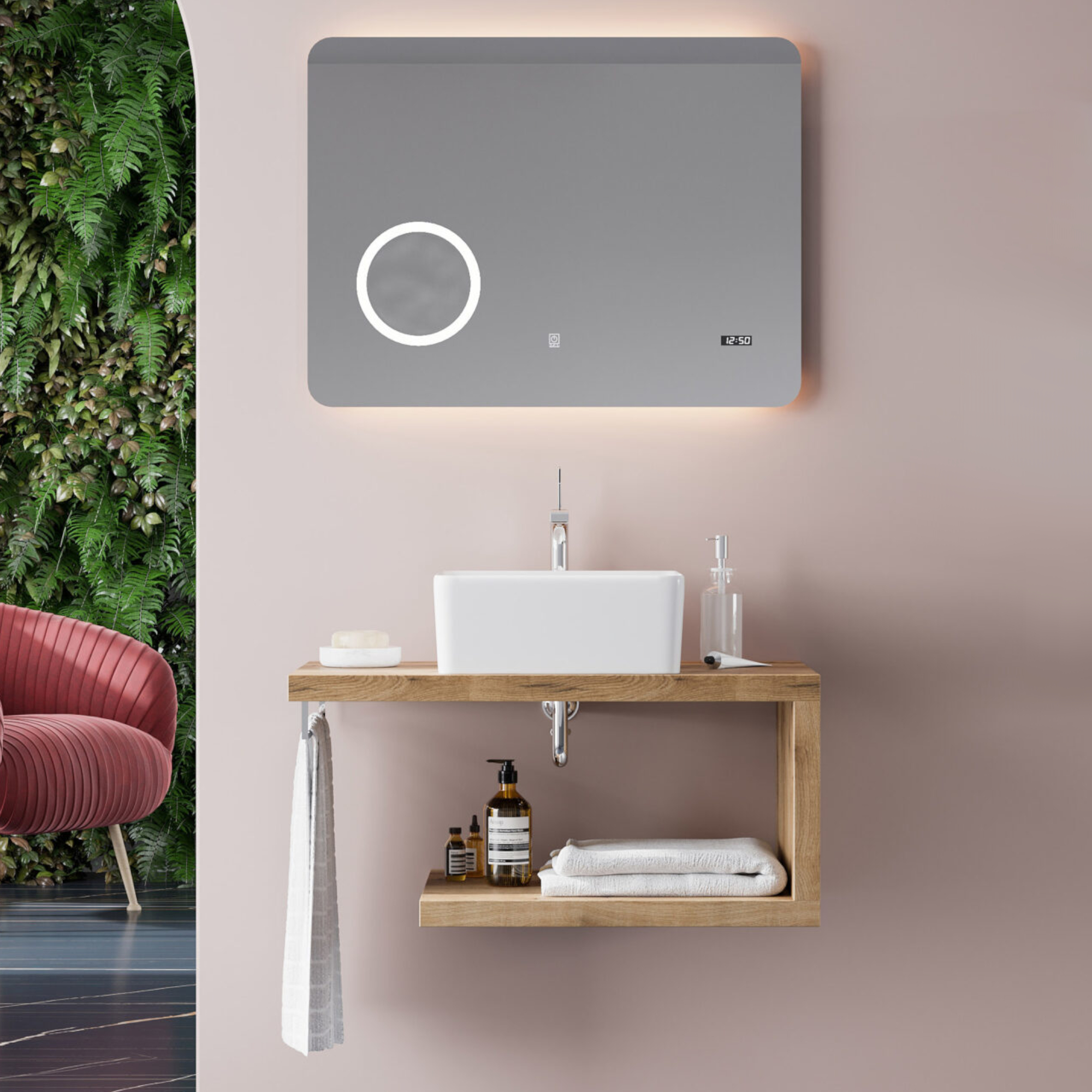 Mensolone bagno da 80 cm rovere naturale con ripiano e specchio filo lucido