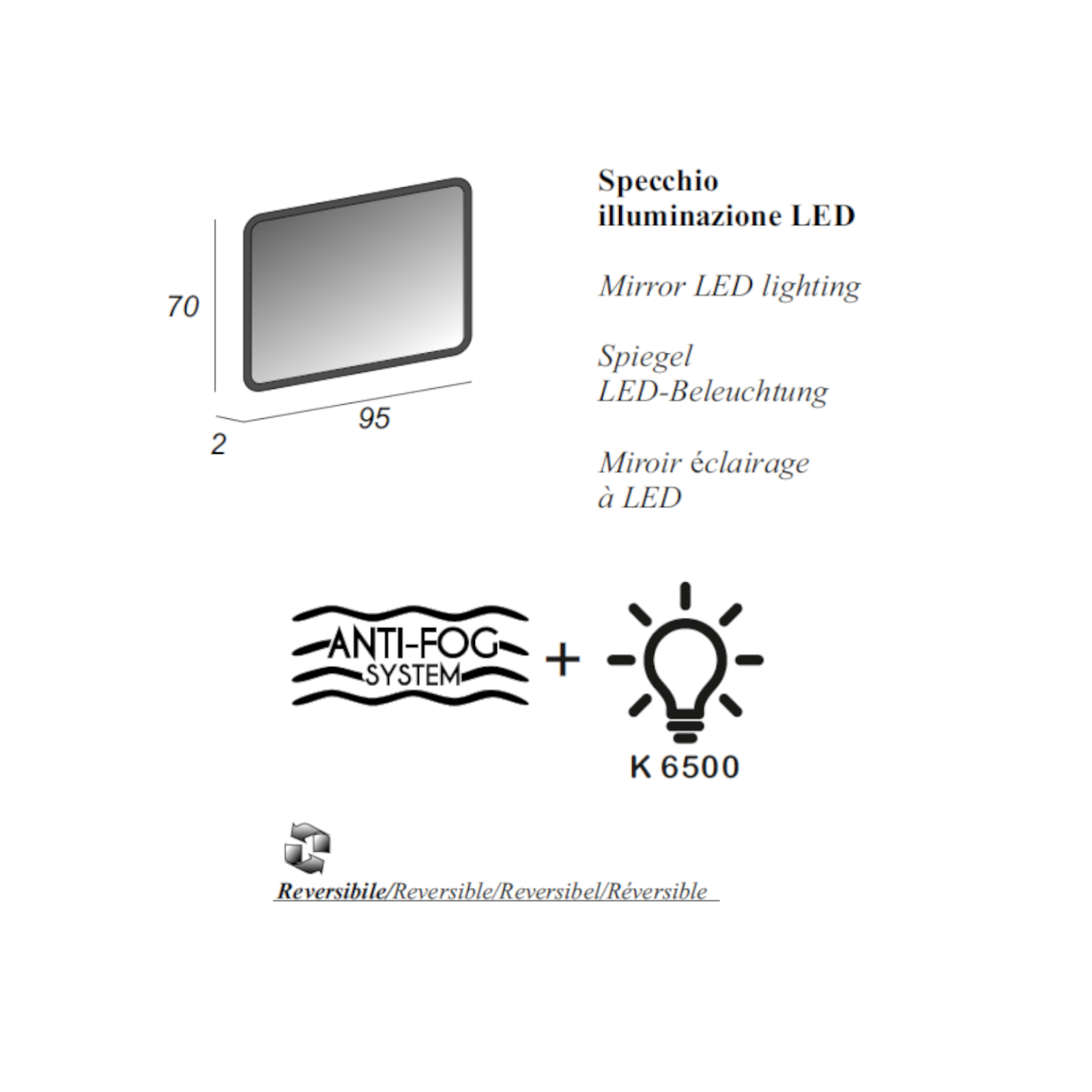 Specchio bagno 95x70 cm con angoli stondati illuminazione led e sistema antiappannamento