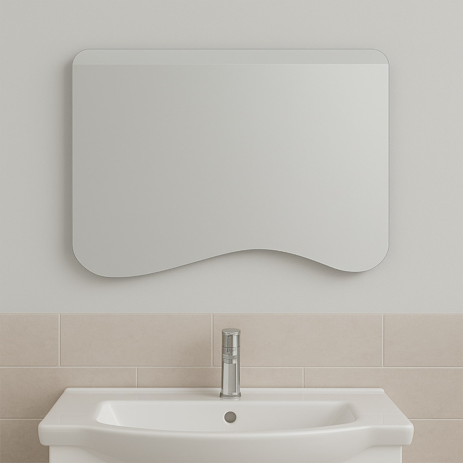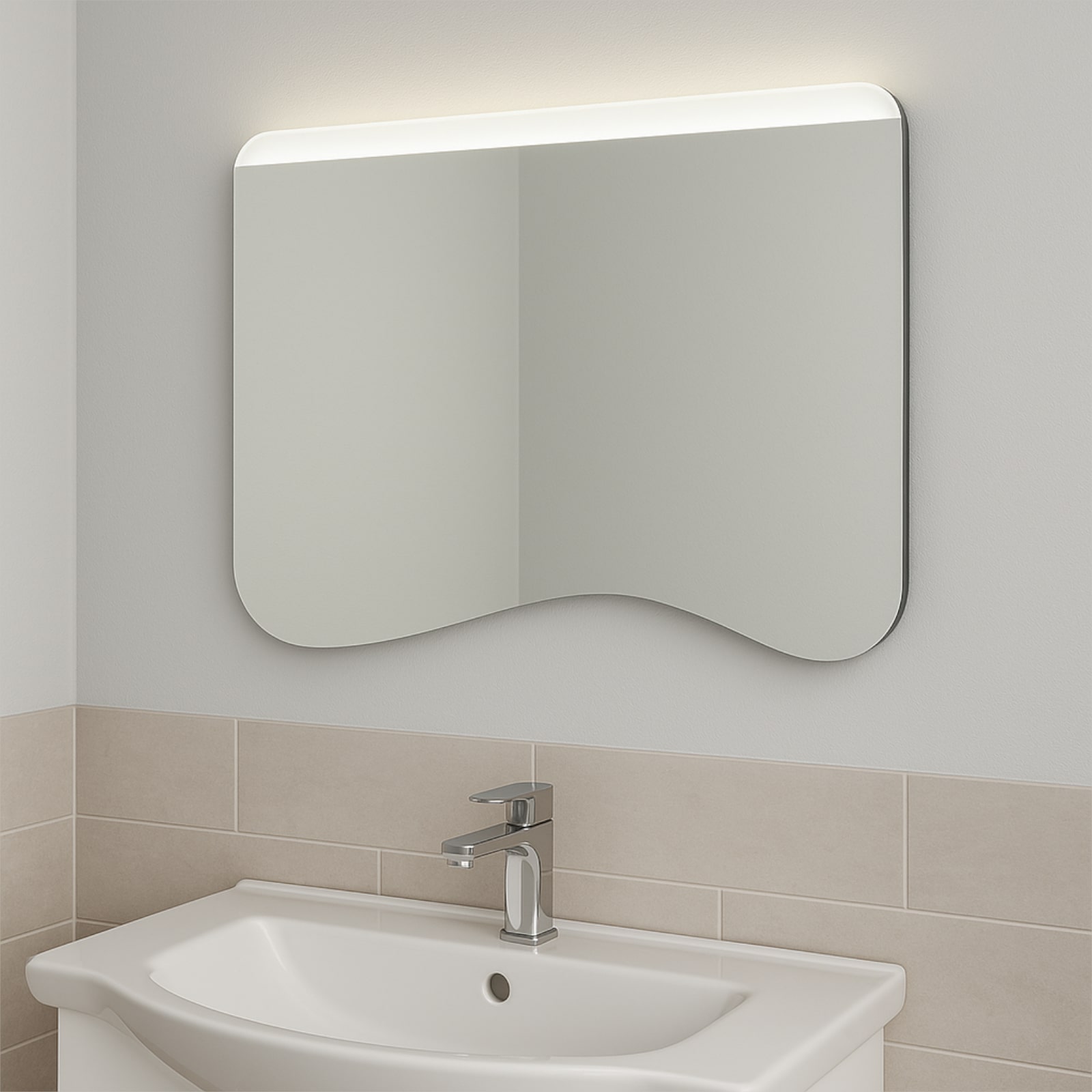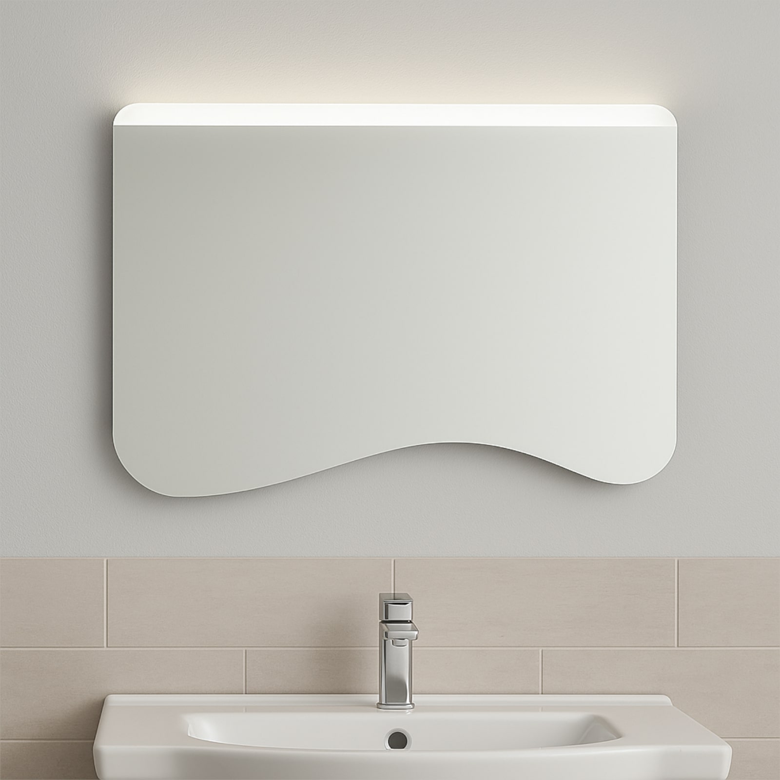 Specchio dalla forma particolare caratterizzato da una illuminazione led, con sensore a infrarossi, che risalta il bordo superiore in vetro satinato.