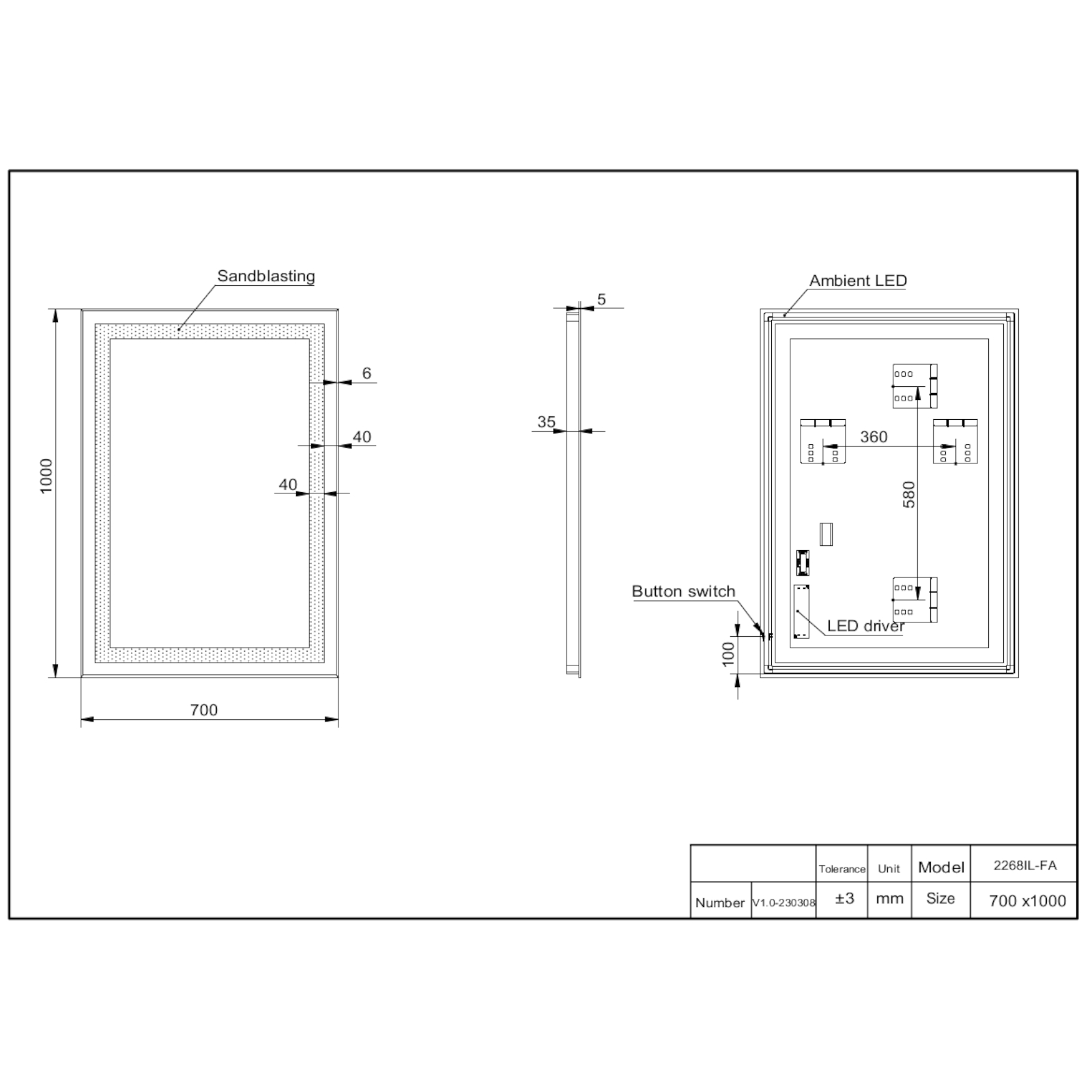 Euroceramica - Sansa - Specchio retroilluminato 70x100 cm - Alluminio - LED 6000-6500K