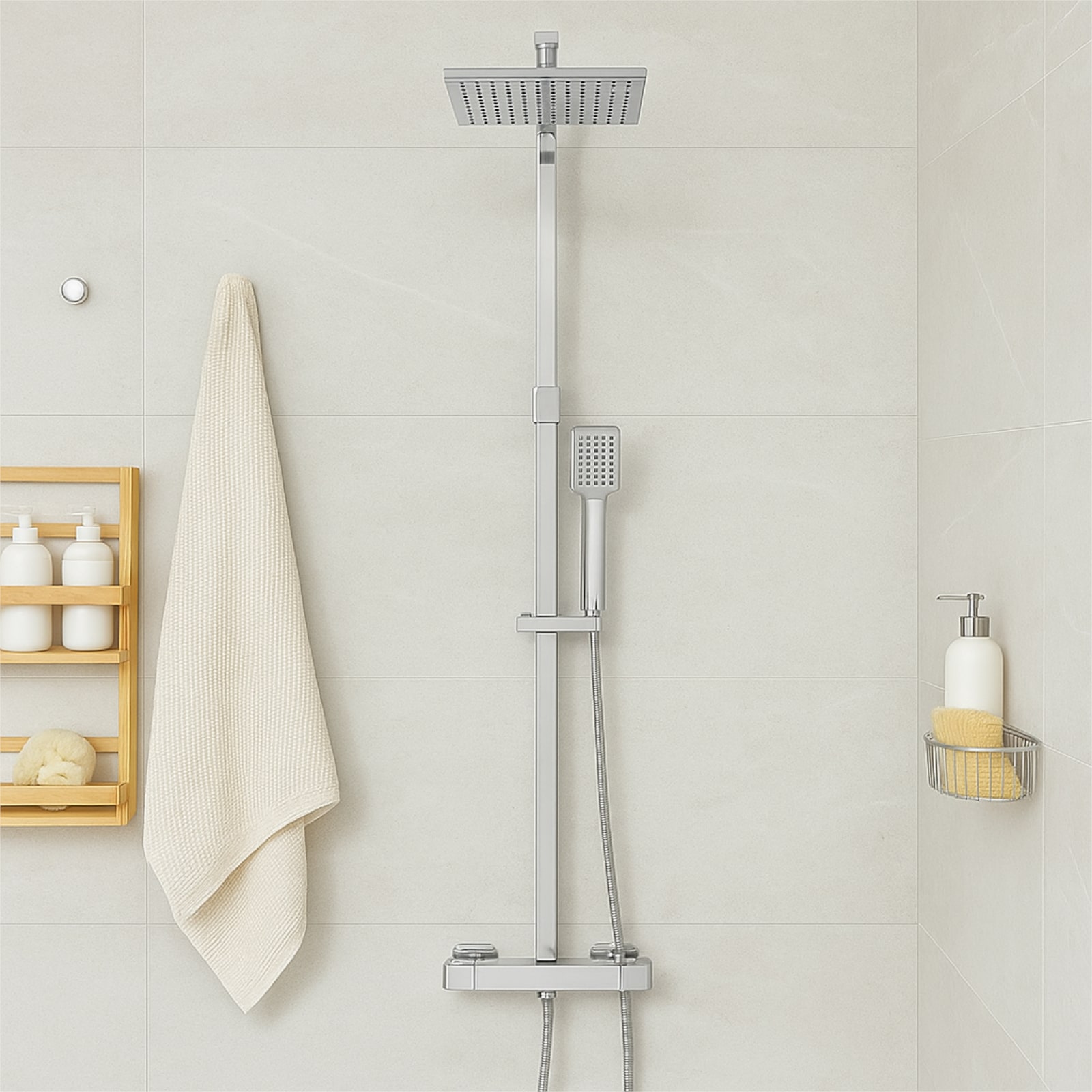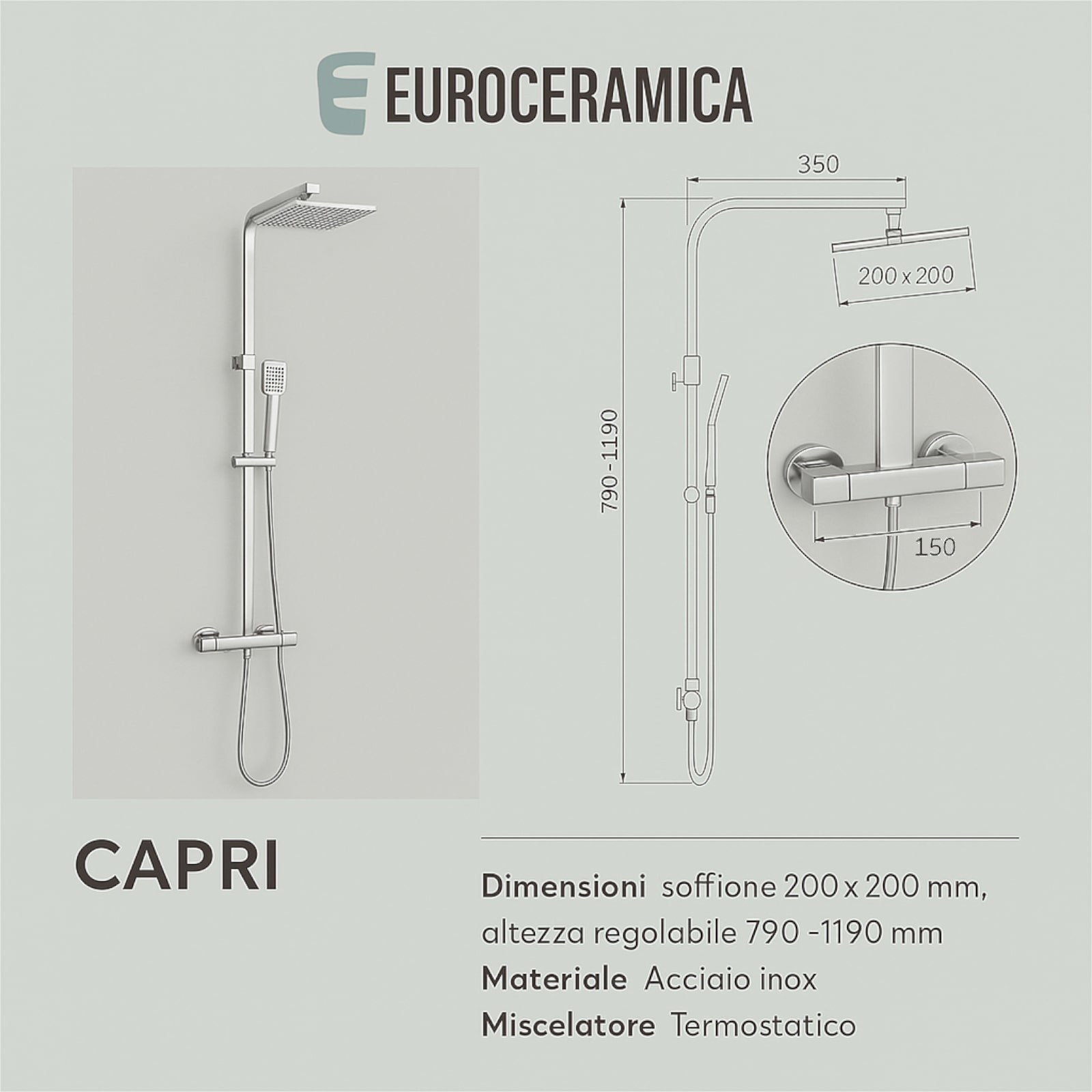 Euroceramica - Capri - Colonna doccia termostatica in acciaio inox con soffione quadrato 20x20 cm